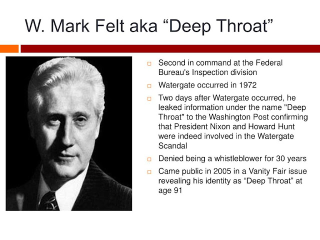 Mark Felt, mas conocido como “Deep Throat” o ”Garganta Profunda” dio la información a los periodistas del Washington Post, Bob Woodward y Carl Bernstein sobre el escándalo Watergate que hizo que el presidente Nixon tuviera que renunciar a su cargo por la grave corrupción que ello implicaba.